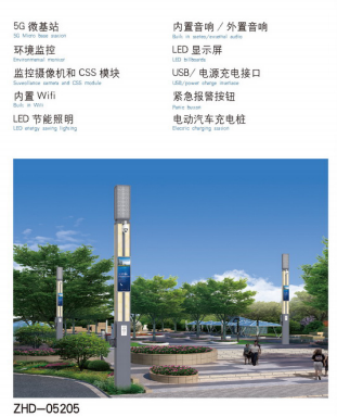 智慧灯杆是利用新一代信息技术,让城市设施以大系统的方式管理及运营。以前的路灯作为城市的公共基础设施,从手动控制开关到自动控制,从单一的照明功能到多动能化智能灯杆,经历一系列的变化。如今,智能灯杆正在慢慢走进大众的视野中。本款路灯可配备5G微基站、环境检测、监控摄像头和CSS模块、内置wifi、LED节能照明、内置音响/外置音响、LED显示屏、USB/电源充电接口、电动汽车充电桩灯一系列智能控制系统。